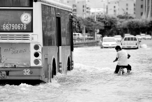 | 八月七日中午,海口市滨涯路还有大面积的积水,不少车辆在水中前行。