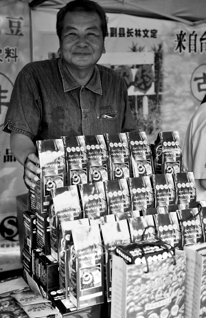 | 今年3月举办的第二届福山咖啡文化节上,林文定向游客推销他的古色咖啡。