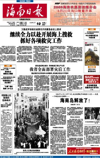 海南日报 头版 001 2009-08-101 2009年08月10日 星期一