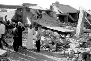 | 8月10日,在伊拉克北部城市摩苏尔以东的卡兹那村,村民在爆炸现场围观。 新华社/法新 |