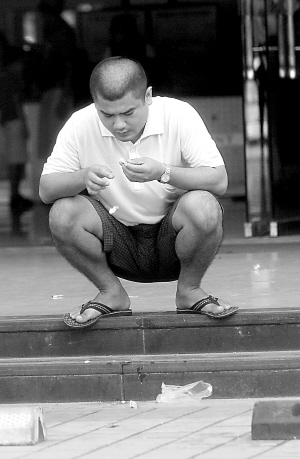 ↑海口汽车南站候车大厅门前,一男子蹲在台阶上,边吃鹌鹑蛋边丢蛋壳。 本报记者 古月 摄