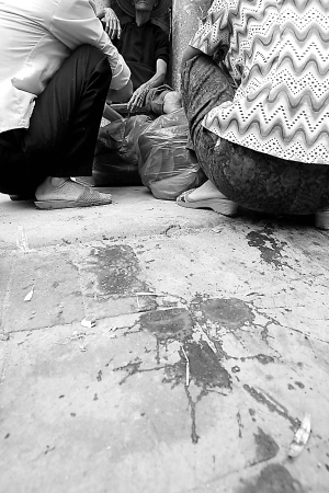 ←在陵水县城的街道上,几位中年妇女蹲在一槟榔小摊前嚼槟榔,不时转身吐槟榔汁。 本报记者 古月 摄