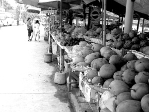 | 8月11日,陵水新村港干净整洁的水果摊。 本报记者 于伟慧 摄 |