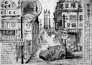 画面上,当年国民党在海南的统治机关“海南特区行政长官公署”赫然在目;如今,这里已被海口市新华南路5号信兴电器城的一派繁华所替代。图中曾象征国民党最高行政机构的“海南特区行政长官公署”,以及“海口警备司令部”,当年被解放军一举攻克,连大牌子还没顾得摘下,国民党便仓皇逃跑了;门楼上方的青天白日旗已黯然落下,代之而起的是一面鲜艳的五星红旗,它在解放军高呼的号角中徐徐升起,迎风飘扬。海南岛的首府,琼崖政治、经济、文化的中心海口市,从此旗帜更改,回到了人民的怀抱!