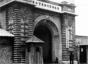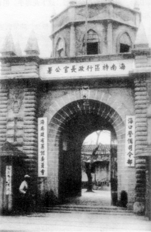 这一天正是1950年4月23日。解放军以不可阻挡之势攻克国民党在海南的最高权力机构。富有历史意味的是,“誓死”守卫海南的国民党防卫总司令薛岳,一年前就布下的“伯陵防线”企图将解放军消灭在琼岛。然而不出一年,身为总司令的他却丢兵卸甲,在海口解放的前一夜最先从海南乘机逃到台湾,留下溃不成军的国民党军几万人,做最后的顽抗。门楼上悬挂的“海南建省筹备委员会”和“海南特区行政长官公署”以及“海口警备司令部”的牌子,只能留作国民党失败前的历史印记。