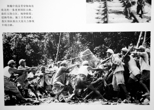 图片上,数十名健壮的勇士有的手握钢锹,有的拉着麻绳,齐心协力,一步步让树头“挪窝”。壮士们个个精神抖擞,干劲冲天。这些从硝烟弥漫的战场走来的勇士,又投身于琼岛火热的筑路大战,一下由作战部队变成了一支建设大军。