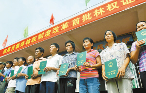 | 8月12日,临高县博厚镇抱珍村20多位村民领到了盼望已久的林权证。同时他们还得到了县农村信用联社提供的1万元到3万元不等的贷款。 本报记者 王凯 摄 |