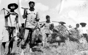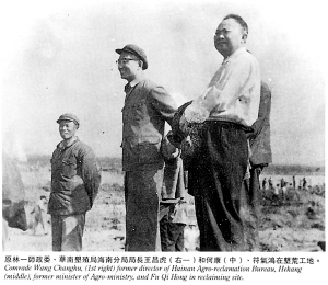 原林一师政委、华南垦殖局海南分局局长王昌虎(右一)和何康(中)、符气鸿当年在垦荒工地。