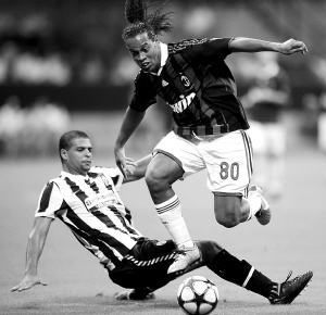 | 8月18日,在贝卢斯科尼杯赛中,AC米兰以5比4点球战胜尤文图斯。图为罗纳尔迪尼奥(右)带球突破。 新华社发 |