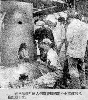 为了放出钢铁“卫星”,有的市县还采用一些荒唐的方法炼铁炼钢:琼山县把府城镇东门的旧城门堵起来搞5000吨的大炼铁窑;东方县在山岭和山沟挖地下窑炼铁;琼东县则用家用水缸来炼钢等。当年11月1日,没有钢铁产业基础的海南,也不可思议地放出日产生铁43453.82吨的大“卫星”,其中文昌、琼山两县突破日产万吨铁;25日,又放出日产钢15234吨的炼钢“卫星”。