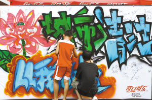 海南首届零度可口可乐涂鸦大赛,日前在海口上邦百汇城举行。参赛选手联手创作了一幅题为“城市清洁 从我做起”的作品,市民纷纷在作品上签名,为创建文明椰城作出了承诺。 (王海)