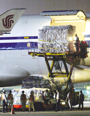 | 8月18日傍晚,大陆援助台湾灾区空运物资抵达高雄。 新华社发 |