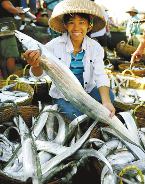 今年伏季休渔刚结束,热带风暴又接踵而至,严重影响海洋渔业生产。近日,随着天气的好转,我省渔民加紧出海作业,远航的渔船也陆续返港,琼海市潭门港又呈现出一片繁忙的丰收景象。 8月17日,渔民高兴地展示新鲜海鱼。 特约记者 蒙钟德 摄