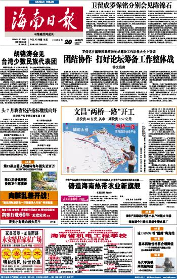 海南日报 头版 001 2009-08-201 2009年08月20日 星期四