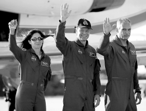 8月19日,在美国佛罗里达州卡纳维拉尔角肯尼迪航天中心,“发现”号航天飞机宇航员挥手致意。经过为期两天的评估,美国航天局当日表示,“发现”号航天飞机可以按计划于美国东部时间8月25日1时36分发射升空。 新华社/路透