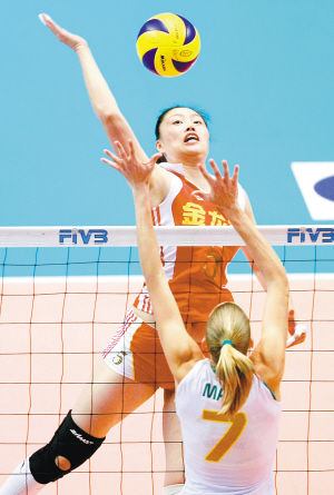 8月20日,在日本东京举行的2009年世界女排大奖赛总决赛第二轮比赛中,中国队以0比3不敌巴西队,遭遇两连败。图为中国队队员马蕴雯扣球。 新华社发