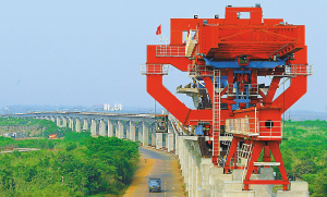 | ↑气势如虹的东环铁海口双线特大桥,目前已完成全部621座桥墩建设,铺架工作正在以每天百米速度向前推进。该桥全长21.37公里,为全线最长桥梁。 |