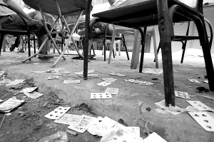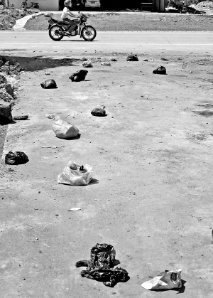① 海口龙舌坡,一次性筷子、纸屑、烟头一地。 ② 海口长流镇,垃圾虽然入袋但是随意乱丢。 ③ 海口丁村路口,塑料袋、饮料瓶、水果皮随手乱丢,地面垃圾一片。 ④ 海口龙舌坡,扑克牌、纸屑乱丢一地。 本栏照片均由本报记者古月摄