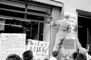 | 1966年8月23日,上海红卫兵在南京路上贴大字报。新华社发 |