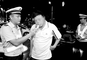 | 海口市交巡警支队干警检测司机酒精含量。本报记者 王凯 摄 |