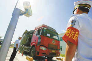 | 8月23日,执法队员在对一辆总重112.6吨,超重57.6吨的车辆进行载重检测。 本报记者 张杰 通讯员 陈涛 摄 |
