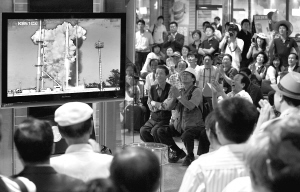 | 8月25日,在韩国首都首尔,市民们通过电视观看韩国首枚运载火箭“罗老”号升空。 新华社/法新 |