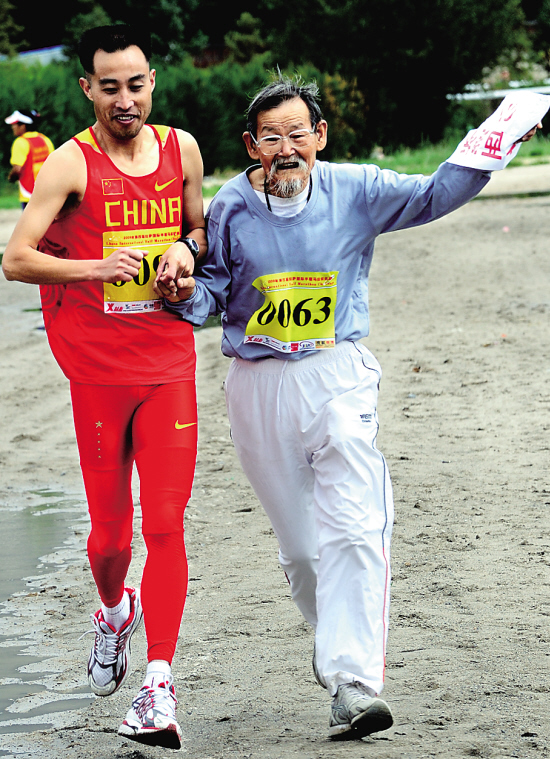 25日,第四届拉萨国际半程马拉松挑战赛在拉萨举行,在海拔3670米的21公里比赛中,76岁的孙天恩(右)老人和队友携手到达终点。 新华社发