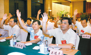 这是与会同志举手表决,审议通过《中共海南省委关于实施新时期农村党的建设“强核心工程”的意见》和《中共海南省委员会全体会议任用重要干部投票表决办法(试行)》的情景。