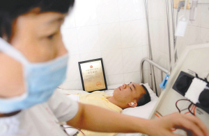 | 小郑在捐献造血干细胞的情形 。