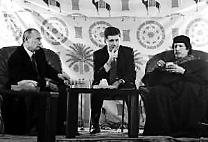| 去年11月1日,俄罗斯总理普京(左一)来到利比亚领导人卡扎菲(右一)搭建在莫斯科克里姆林宫的贝都因人帐篷内会见卡扎菲。 新华社资料照片 |