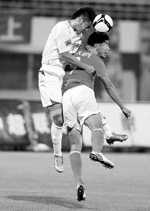 | 8月26日,在2009年中超联赛第19轮比赛中,长春队主场以3比2战胜山东队。图为山东队球员韩鹏(右)与长春队球员争顶。 新华社发 |