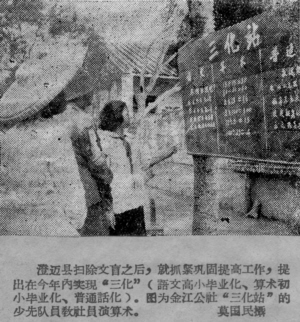 | 1958年11月,澄迈县扫除文盲之后,就抓紧巩固提高工作,提出年内实现“三化”(语文高小毕业化、算术初小毕业化、普通话化)。图为金江公社“三化站”的少先队员教社员演算算术。莫国民 摄 本报记者 林萌 翻拍 |