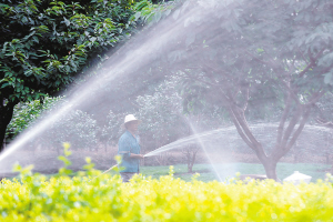 8月27日,园林工人为长沙市一处草坪浇水灌溉。 截至当日,今年以来湖南省会长沙高温日已超过35天,成为高温日最多的省会城市。气象部门预报,长沙市8月28日最高气温将达37℃。 新华社发