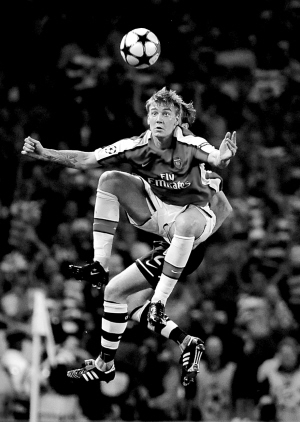 27日,在欧冠资格赛附加赛第二回合比赛中,阿森纳队主场以3比1战胜凯尔特人队,从而以5比1的总比分晋级小组赛。图为阿森纳队球员本特纳(前)在比赛中争顶。 新华社发