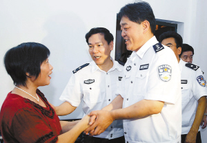 | 8月27日上午,公安部慰问组来到王光生烈士家中进行慰问,并给王光生烈士的妻子冯玉玲和儿子送来了公安部长孟建柱签发的慰问信,颁发了纪念牌匾和慰问金。 本报记者 苏晓杰 摄 |