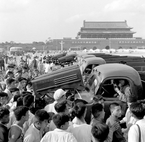 | 1956年8月21日在天安门广场上,首都人民纷纷前来参观第一批“解放牌”汽车。新华社发 |