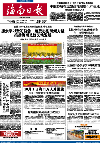 海南日报 头版 001 2009-08-281 2009年08月28日 星期五