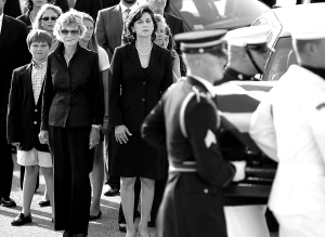 8月27日,肯尼迪家族成员目送马萨诸塞州参议员爱德华·肯尼迪的灵柩被运送至马萨诸塞州波士顿市约翰·肯尼迪总统图书馆。爱德华·肯尼迪的遗体将在这里安放两日,之后于29日举行悼念仪式和葬礼。爱德华·肯尼迪25日晚因罹患脑癌去世,享年77岁。 新华社/路透