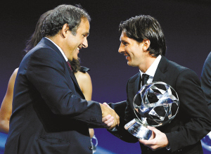 欧足联年度最佳奖项揭晓 梅西当选最佳球员 28日,梅西(右)接受欧足联主席普拉蒂尼颁发的上赛季年度最佳球员奖杯。哈维获最佳中场,特里获最佳后卫,范德萨获最佳门将,马尔蒂尼获得特别奖。 新华社发