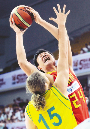 | → 8月29日,在江苏昆山举行的2009斯坦科维奇杯洲际篮球赛中,中国队以74:76不敌澳大利亚队。图为苏伟(上)在比赛中上篮。 新华社发 |