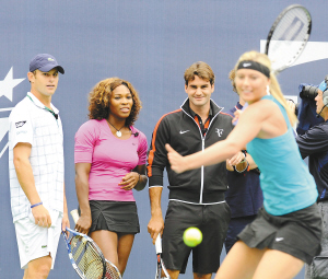 | 8月30日,前美网冠军小威、费德勒、莎拉波娃(从左至右)在纽约国家网球中心的中心球场与球迷共度亚瑟·阿什儿童日。