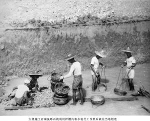 | 当年边勘探边开采。图为利用槽内积水淘洗砾石,然后就地粗洗。