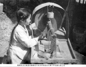 | 勘探队用自己装置的脚踏切片机制造岩石薄片和切磨水晶。