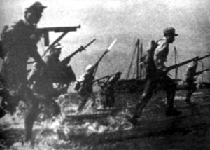刘振华带领周围4只船的200多人先行登陆。在敌人激烈的枪炮声中,有的船只中弹下沉了,也有的船体被打漏,有的机器被打坏,一名副团长和几名战士受伤。