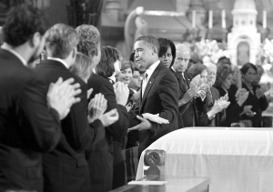 奥巴马赞他为“民主党之魂” 8月29日,在美国马萨诸塞州波士顿的一座教堂,美国总统奥巴马(中)在联邦参议员爱德华·肯尼迪的葬礼上慰问肯尼迪家属。当天,奥巴马在葬礼上赞扬这名去世联邦参议员为“民主党之魂”。 新华社/路透