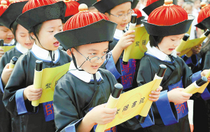 | 9月1日,杭州市紫阳小学新生在古礼入学仪式上诵读入学三字经。 |