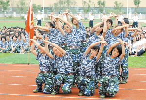 | 9月1日,在东汽八一中学开学典礼现场,学生在进行军训汇报表演。 |
