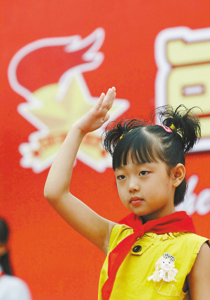 | 9月1日,合肥市包河区外国语实验小学的学生张舒羽面向国旗行少先队队礼。