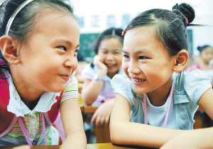 | 9月1日,在福州教育学院附属第一小学就读一年级的台北小朋友吴巧茵(右)结识了新朋友。 |