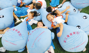 | 9月1日,在都江堰市北街小学新校区,小学生们开心相拥校方制作的代表感激的“水滴娃娃”。